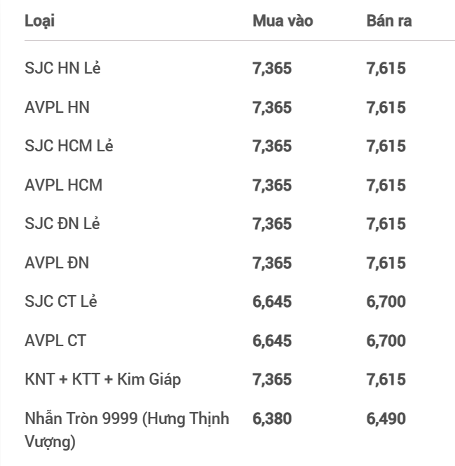 Vàng SJC tại Công ty Vàng bạc đá quý Sài Gòn hiện đang giao dịch từ 73,70-76,20 triệu đồng/lượng, giảm 240 ngàn đồng/lượng chiều mua vào và giảm 480 ngàn đồng/lượng chiều bán ra so với hôm qua. Tương tự, Công ty Vàng bạc Phú Quý giao dịch ở mức 73,75-76,20 triệu đồng/lượng, giảm 150 ngàn đồng/lượng chiều mua vào và giảm 350 ngàn đồng/lượng chiều bán ra so với hôm qua.