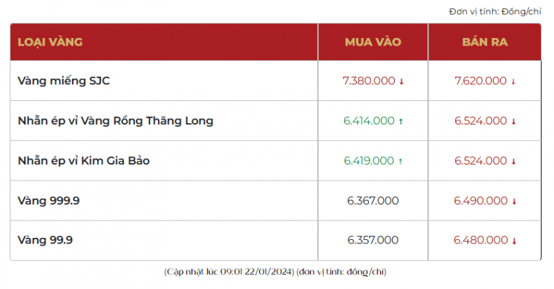 Thời điểm 10h00 sáng ngày 22/1/2024, giá vàng SJC tại Công ty Doji Hà Nội giao dịch ở mức 73,65-76,15 triệu đồng/lượng mua vào - bán ra, giảm 350 ngàn đồng/lượng chiều mua vào và giảm 470 ngàn đồng/lượng chiều bán ra so với ngày hôm qua.