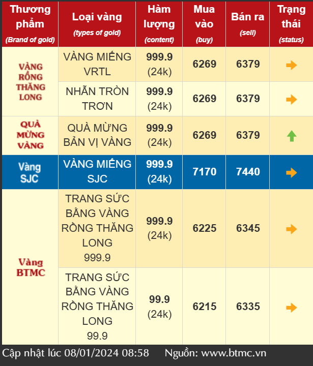 Còn tại Bảo Tín Mạnh Hải đang được giao dịch ở mức 71,50 - 74,50 triệu đồng/lượng mua vào - bán ra, giảm 500 ngàn đồng/lượng chiều mua vào và giảm 500 ngàn đồng/lượng chiều bán ra so ngày hôm qua.