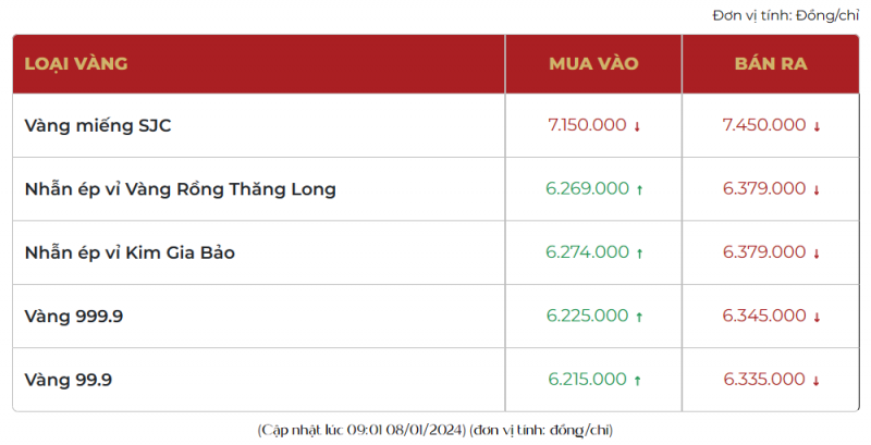 Trên thị trường thế giới, khoảng 9 giờ 30 ngày 8/1 (giờ Việt Nam), trên Kitco, giá vàng giao ngay ở mức 2.042,88 USD/ounce, giảm 0,57 USD/ounce (-0,03%). Như vậy, quy đổi theo tỷ giá Vietcombank (chưa thuế, phí), giá vàng thế giới tương đương gần 60,4 triệu đồng/lượng, thấp hơn giá vàng miếng khoảng 14,5 triệu đồng/lượng.