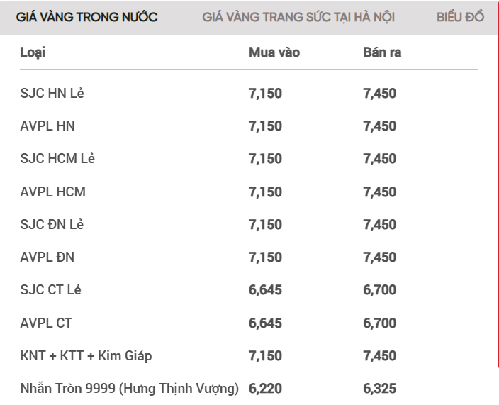 Vàng trang sức bằng Vàng rồng Thăng Long 999.9 (vàng 24k) của Công ty TNHH Bảo Tín Minh Châu giao dịch quanh mức 62,69 - 63,79 triệu đồng/lượng mua vào - bán ra, tăng 110 ngàn đồng/lượng chiều mua vào và tăng 110 ngàn đồng/lượng chiều bán ra so với hôm qua. Vàng trang sức bằng Vàng rồng Thăng Long 99.9 (vàng 24k) đang giao dịch quanh mức 62,15 - 63,35 triệu đồng/lượng mua vào - bán ra, giảm 100 ngàn đồng/lượng chiều mua vào và giảm 100 ngàn đồng/lượng chiều bán ra so với ngày hôm qua.