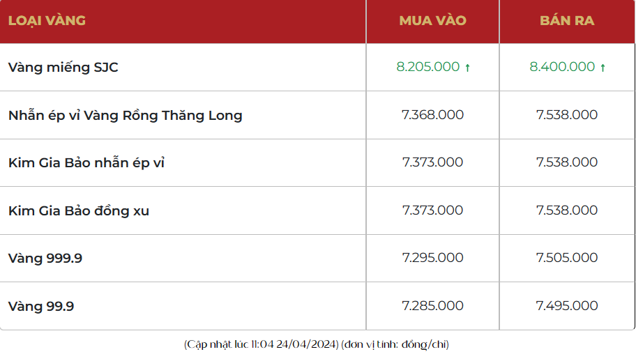 Trang sức bằng vàng rồng Thăng Long 999.9 (24k) cũng giảm 50 ngàn đồng/lượng ở chiều mua và bán, đang giao dịch quanh mức 72,95 - 75,15 triệu đồng/lượng.