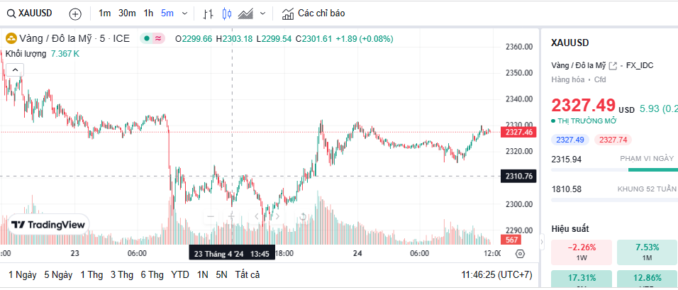 Trên thị trường vàng thế giới, giá vàng trưa 24/4 ở mức 2.327 USD/ounce, tăng 20 USD so với chiều qua. Mức giá này sau quy đổi tương đương 71,2 triệu đồng/lượng. Hiện giá vàng thế giới đang thấp hơn vàng SJC khoảng 12,6 triệu đồng từ mức 9,3 triệu đồng/lượng vào sáng qua. Còn vàng nhẫn 999.9 đang cao hơn vàng thế giới 3,6- 4,2 triệu đồng/lượng.