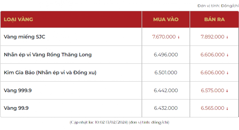 Giao dịch giá vàng sáng ngày 13/2 (Mùng 4 Tết), giá vàng SJC được một số doanh nghiệp ở TP. Hồ Chí Minh niêm yết mua vào 76,30 triệu đồng/lượng, bán ra 78,80 triệu đồng/lượng, giảm khoảng 200.000 đồng/lượng so với hôm qua. Đây là mức giảm khá mạnh của vàng SJC trong những ngày qua.