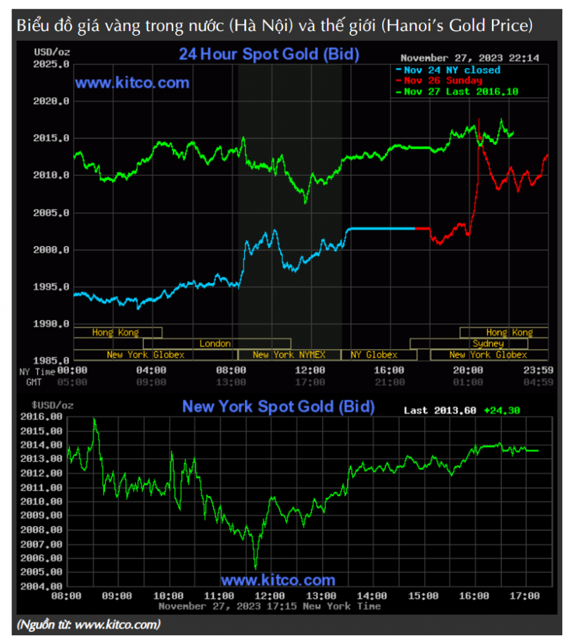 Giá vàng thế giới ngày 28/11 tăng thêm 4 USD/ounce, lên 2.016 USD/ounce, giao dịch ở gần mức cao nhất trong vòng 6 tháng qua. Kim loại quý đang nhận được sự hỗ trợ tăng giá từ việc USD giảm về mức thấp nhất trong vòng 3 tháng. Đồng thời thông tin Cục Dự trữ Liên bang Mỹ (Fed) sẽ cắt giảm lãi suất sớm hơn đang ủng hộ vàng tăng giá. Theo công cụ CME FedWatch, các thị trường thấy 25% cơ hội tăng lãi suất sớm nhất là vào tháng 3. Tuy nhiên, thị trường thấy tỉ lệ cắt giảm nhiều khả năng vào tháng 5 hoặc tháng 6.