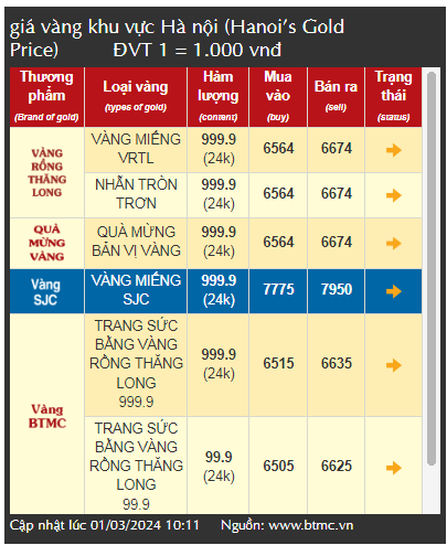 | Giá vàng niêm yết tại Bảo Tín Minh Châu. Ảnh chụp website màn hình lúc 11h00 ngày 1/3/2024 |