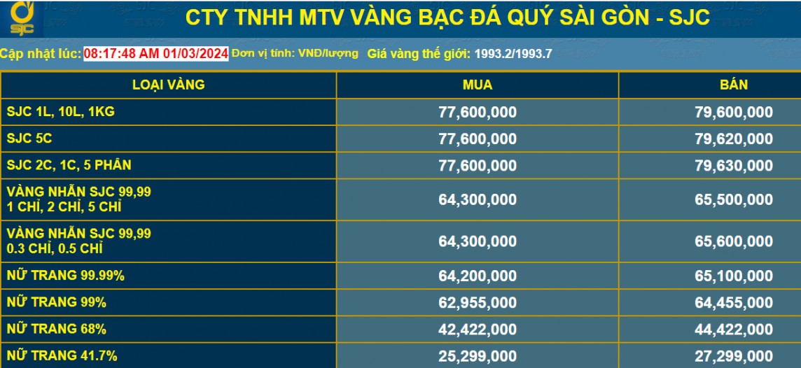Thời điểm 11h ngày 1/3/2024, giá vàng SJC trong nước tiếp tục được điều chỉnh tăng so với rạng sáng cùng ngày. Công ty TNHH MTV Vàng Bạc Đá quý Sài Gòn - SJC niêm yết giá vàng SJC ở mức 77,6 triệu đồng/lượng mua vào và 79,6 triệu đồng/lượng bán ra. Chênh lệch giá mua bán tại đơn vị này vẫn đang ở mức 2 triệu đồng.