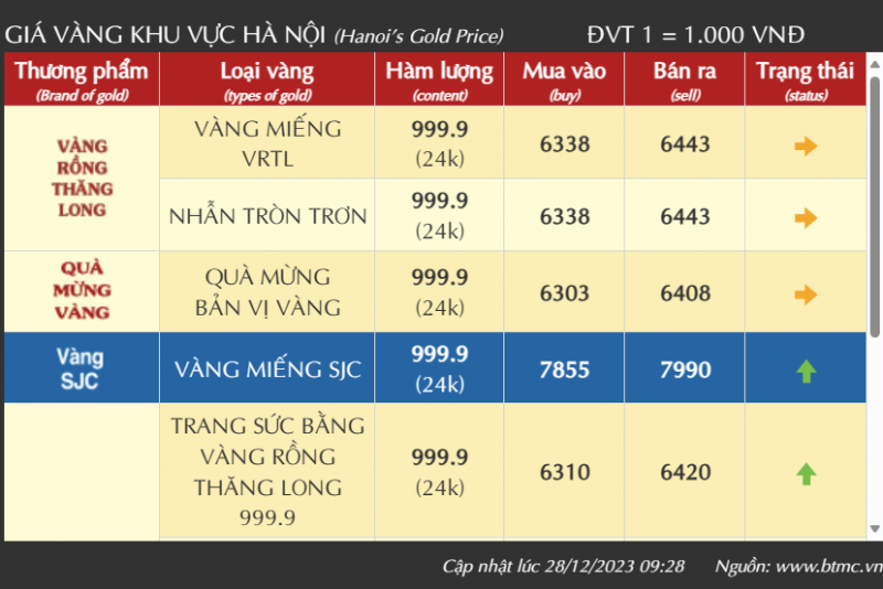 Tính đến 11h15 ngày 28/12, giá vàng SJC tại Công ty Doji Hà Nội giao dịch ở mức 78,20-80,00 triệu đồng/lượng mua vào - bán ra, tăng 255 ngàn đồng chiều mua vào và 240 ngàn đồng chiều bán ra so với ngày hôm qua.