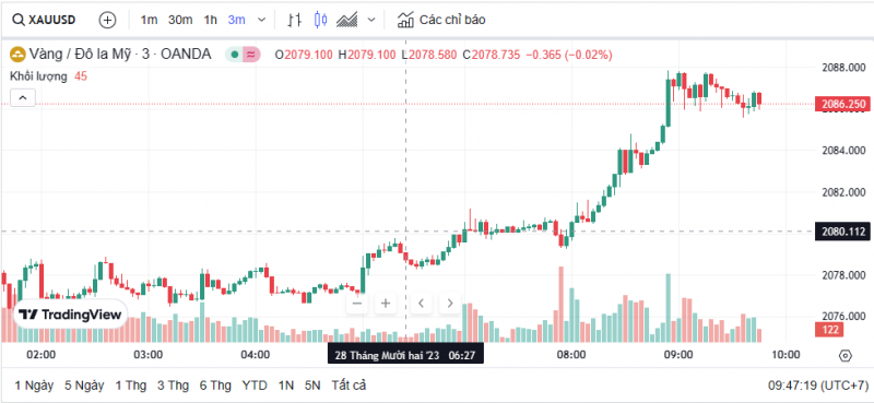 Ghi nhận lúc 5h00 hôm nay (giờ Việt Nam), theo Kitco, giá vàng giao ngay ở mức 2.077,595 USD/ounce, tăng 9,455 USD/ounce so với cùng thời điểm sáng qua. Giá vàng giao tháng 2/2024 trên sàn Comex New York ở mức 2.080 USD/ounce.