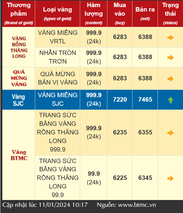 Vàng trang sức bằng Vàng rồng Thăng Long 999.9 (vàng 24k) của Công ty TNHH Bảo Tín Minh Châu giao dịch quanh mức 62,83 - 63,88 triệu đồng/lượng mua vào - bán ra, tăng 150 ngàn đồng/lượng chiều mua vào và tăng 80 ngàn đồng/lượng chiều bán ra so với hôm qua. Vàng trang sức bằng Vàng rồng Thăng Long 99.9 (vàng 24k) đang giao dịch quanh mức 62,35 - 63,55 triệu đồng/lượng mua vào - bán ra, tăng 50 ngàn đồng/lượng chiều mua vào và tăng 50 ngàn đồng/lượng chiều bán ra so với ngày hôm qua.