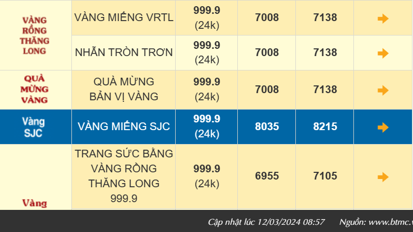 Thời điểm trưa ngày 12/3, giá vàng SJC giao dịch tại Công ty Vàng bạc đá quý Sài Gòn khu vực TP. Hồ Chí Minh quanh mức 80,50 - 82,50 triệu đồng/lượng, tăng 150 ngàn đồng/lượng chiều mua và tăng 150 ngàn đồng/lượng chiều bán so với chốt phiên hôm qua. Chênh lệch mua - bán thu hẹp còn 2 triệu đồng/lượng.