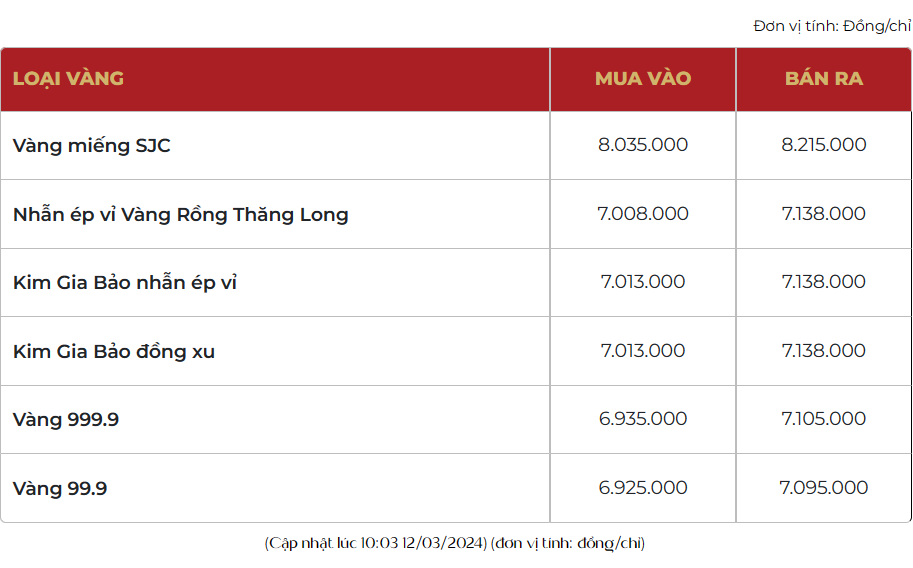 Trang sức bằng vàng rồng Thăng Long 999.9 (24k) đang giao dịch quanh mức 69,55 - 71,05 triệu đồng/lượng, tăng 50 ngàn đồng/lượng chiều mua vào và tăng 50 ngàn đồng/lượng chiều bán ra so ngày hôm qua.