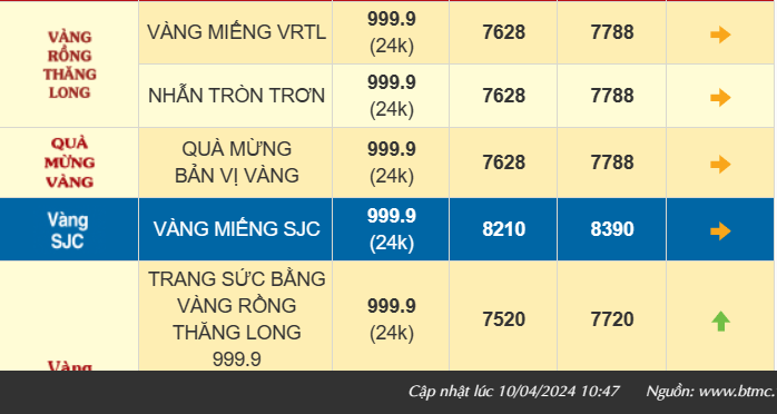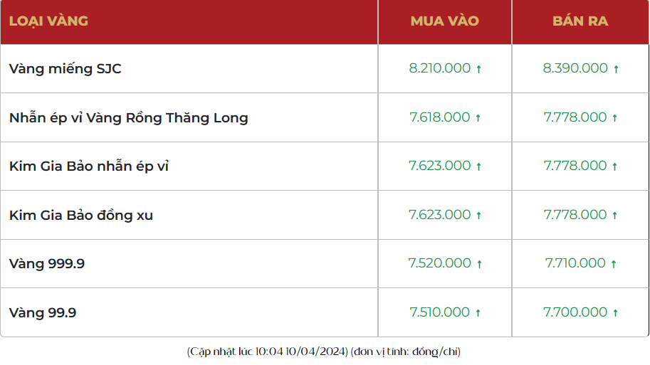 | Giá vàng hôm nay tăng thêm 800 ngàn, vàng nhẫn 999.9 bán ra 75,33 triệu đồng/lượngGiá vàng hôm nay (9/4) leo tiếp đỉnh mới, vàng SJC vượt mốc 83 triệu đồng/lượng |