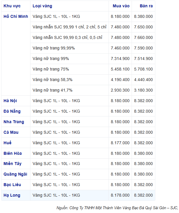 Giá tại Công ty Vàng bạc đá quý Sài Gòn khu vực Hà Nội quanh mức 81,80 - 83,82 triệu đồng/lượng, tăng 800 ngàn đồng/lượng chiều mua và tăng 800 ngàn đồng/lượng chiều bán so với chốt phiên hôm qua. Chênh lệch mua - bán là 2 triệu đồng/lượng.