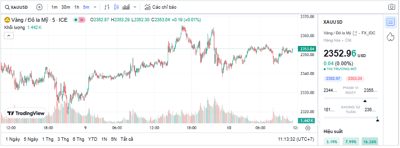Trên thị trường thế giới trưa nay, giá vàng được niêm yết trên Kitco ở mức 2.352 USD/ounce, tăng 13 USD/ounce so với đầu giờ sáng qua. Hiện giá vàng thế giới quy đổi theo tỉ giá niêm yết vào khoảng 71,3 triệu đồng/lượng, thấp hơn vàng nhẫn trơn tới 6,3 triệu đồng/lượng và thấp hơn vàng miếng SJC khoảng 13 triệu đồng/lượng.