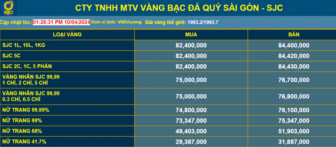 | Giá vàng niêm yết tại Công ty TNHH MTV Vàng Bạc Đá quý Sài Gòn - SJC (Ảnh chụp màn hình lúc 16h ngày 10/4/2024) |