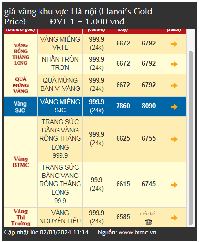 | Giá vàng niêm yết tại Bảo Tín Minh Châu. Ảnh chụp website màn hình lúc 12h00 ngày 2/3/2024 |