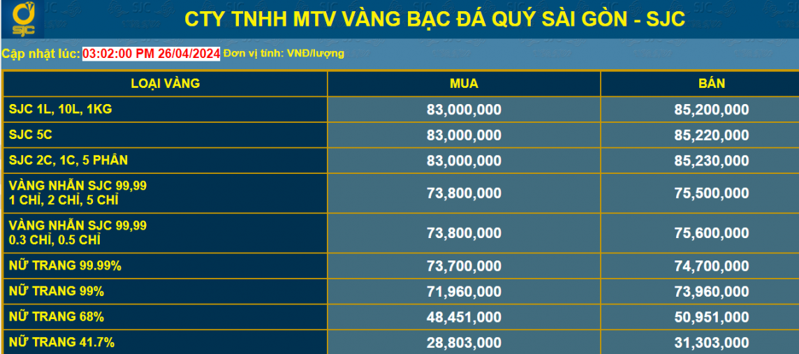 Công ty TNHH MTV Vàng Bạc Đá quý Sài Gòn - SJC niêm yết giá vàng miếng ở mức 83 - 85,2 triệu đồng/lượng mua vào - bán ra.