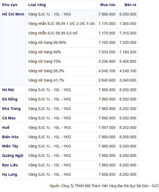 Giá tại Công ty Vàng bạc đá quý Sài Gòn khu vực Hà Nội quanh mức 79,60 - 82,02 triệu đồng/lượng, tăng 500 ngàn đồng/lượng chiều mua và tăng 900 ngàn đồng/lượng chiều bán so với chốt phiên hôm qua. Chênh lệch mua - bán thu hẹp còn 2,4 triệu đồng/lượng.