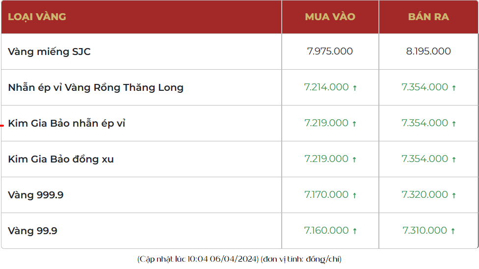Trang sức bằng vàng rồng Thăng Long 999.9 (24k) đang giao dịch quanh mức 71,60 - 73,20 triệu đồng/lượng, tăng 1,55 triệu đồng/lượng chiều mua vào và tăng 1,45 triệu đồng/lượng chiều bán ra so ngày hôm qua.