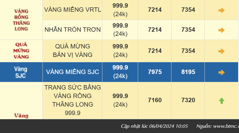 Thời điểm trưa ngày 6/4, giá vàng thế giới và trong nước tăng thẳng đứng. So với hôm qua, giá vàng SJC tăng 1,2 triệu đồng/lượng. Hiện giá vàng SJC tại Công ty Vàng bạc đá quý Sài Gòn khu vực TP. Hồ Chí Minh giao dịch quanh mức 79,60 - 82,00 triệu đồng/lượng, tăng 500 ngàn đồng/lượng chiều mua và tăng 900 ngàn đồng/lượng chiều bán so với chốt phiên hôm qua. Chênh lệch mua - bán thu hẹp còn 2,4 triệu đồng/lượng.