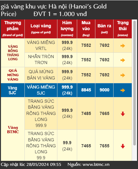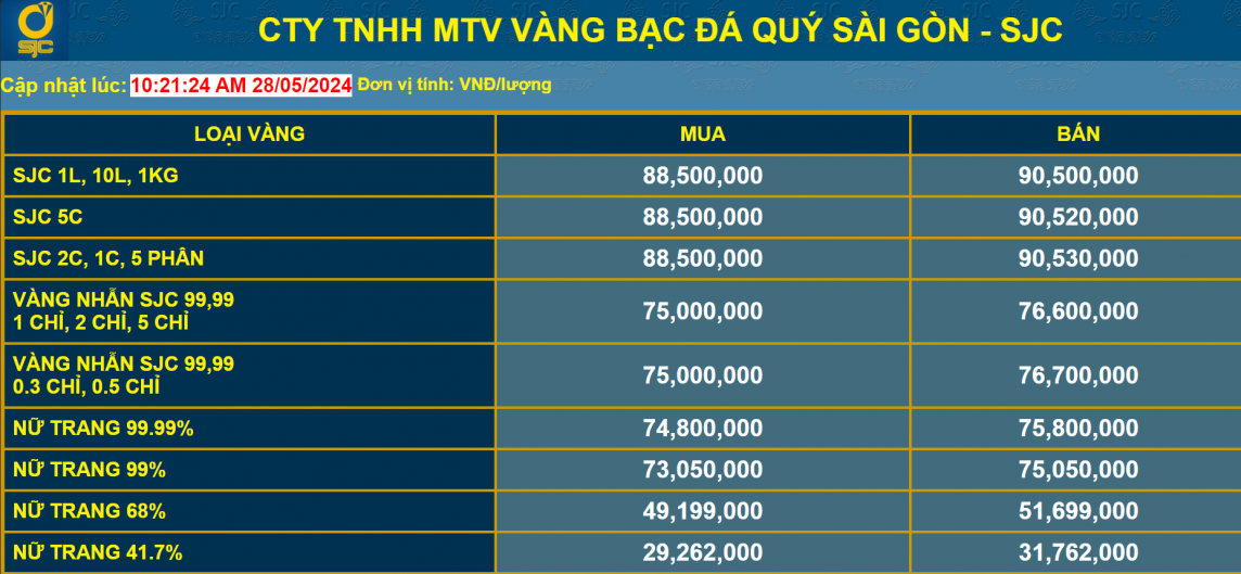 Tuy nhiên, đến thời điểm 10h30p ngày 28/5/2024, giá vàng SJC tại Công ty TNHH MTV Vàng Bạc Đá quý Sài Gòn - SJC lại tăng thêm 100.000 đồng/lượng ở cả hai chiều mua bán. Như vậy, giá vàng SJC tại thương hiệu này đang tăng từng giờ.