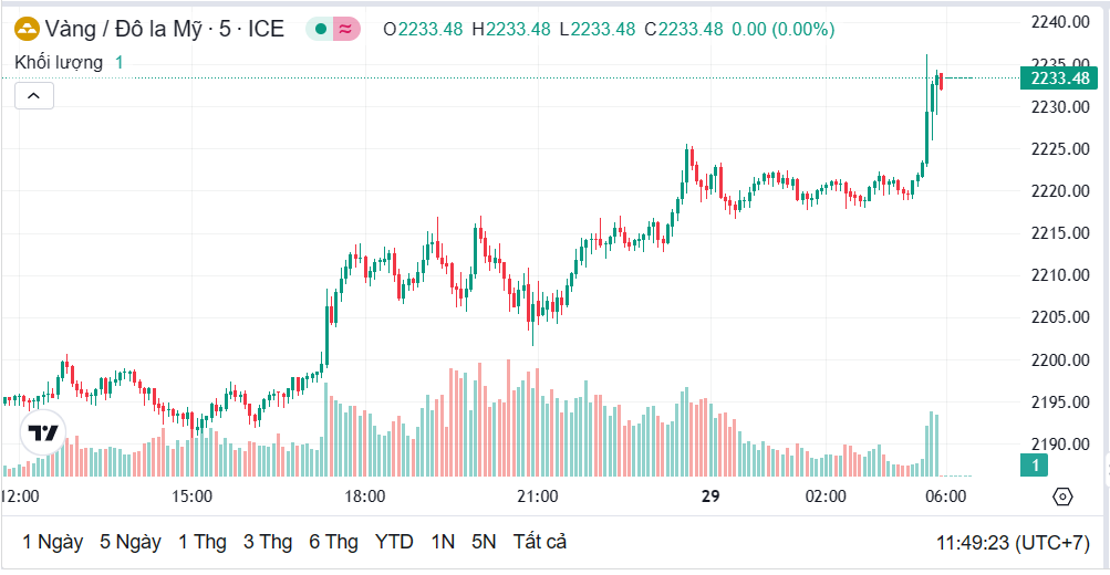 Trên thế giới, giá vàng trong phiên giao dịch đêm 28/3 (rạng sáng nay giờ Việt Nam) đã bất ngờ tăng phi mã. Lúc 11h30 trưa ngày 29/3 theo giờ Việt Nam, vàng giao ngay đang giao dịch quanh 2.233 USD/ounce, tăng tới gần 42 USD so với lúc mở phiên, là mức cao chưa từng có trong lịch sử. Vàng tương lai giao tháng 6 thậm chí giao dịch lần cuối ở mức 2.241 USD/ounce.