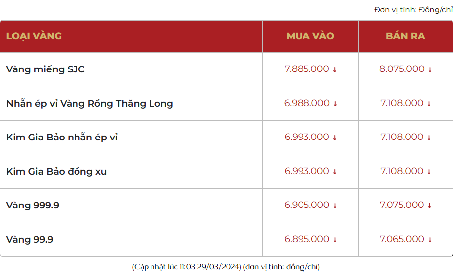 Thời điểm trưa ngày 29/3, giá vàng SJC giao dịch tại Công ty Vàng bạc đá quý Sài Gòn khu vực TP. Hồ Chí Minh quanh mức 79,00 - 81,00 triệu đồng/lượng, giảm 100 ngàn đồng/lượng chiều mua và giảm 100 ngàn đồng/lượng chiều bán so với chốt phiên hôm qua. Chênh lệch mua - bán là 2 triệu đồng/lượng.