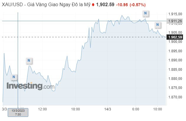 Sáng nay ngày 14/3, giá vàng thế giới đứng ở mức 1.902 USD/ounce. Giá vàng đang ở mức cao nhất trong vòng 6 tuần qua. Giá vàng thế giới tăng gần 2,5%, vọt qua ngưỡng cản 1.900 USD/ounce, khi nhà đầu tư mua mạnh các tài sản an toàn trong bối cảnh thị trường tài chính toàn cầu biến động mạnh do loạt vụ đổ vỡ ngân hàng Mỹ.