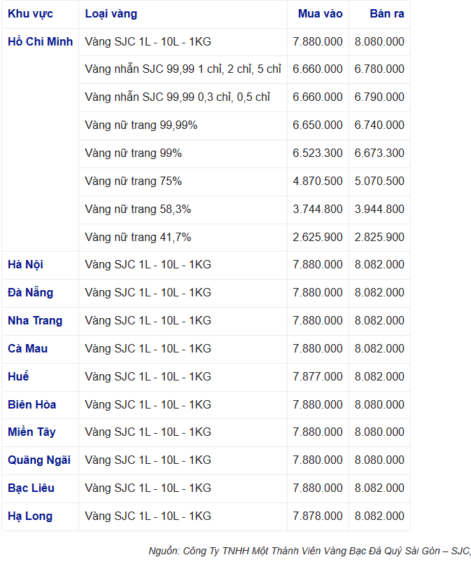 Giá vàng miếng SJC giao dịch tại Công ty Vàng bạc đá quý Sài Gòn khu vực Hà Nội quanh mức 78,90 - 80,82 triệu đồng/lượng, giảm 100 ngàn đồng/lượng chiều mua và giảm 100 ngàn đồng/lượng chiều bán so với chốt phiên hôm qua. Chênh lệch mua - bán lên đến 2 triệu đồng/lượng.