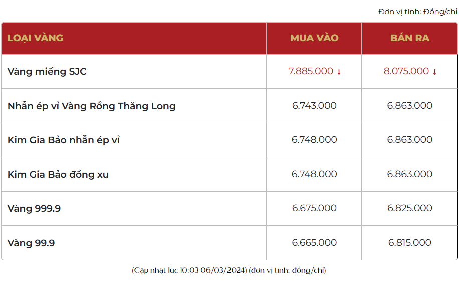 Trang sức bằng vàng rồng Thăng Long 999.9 (24k) đang giao dịch quanh mức 66,95 - 68,25 triệu đồng/lượng, tăng 50 ngàn đồng/lượng chiều mua vào và tăng 50 ngàn đồng/lượng chiều bán ra so ngày hôm qua.