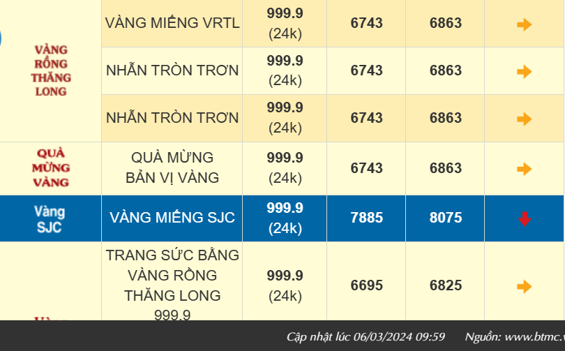 | Giá vàng trong nước ổn định, vàng nhẫn 999.9 bán ra 67,98 triệu đồng/lượngGiá vàng trong nước tiếp tục lập đỉnh, vàng nhẫn 999.9 bán ra 68,58 triệu đồng/lượng |