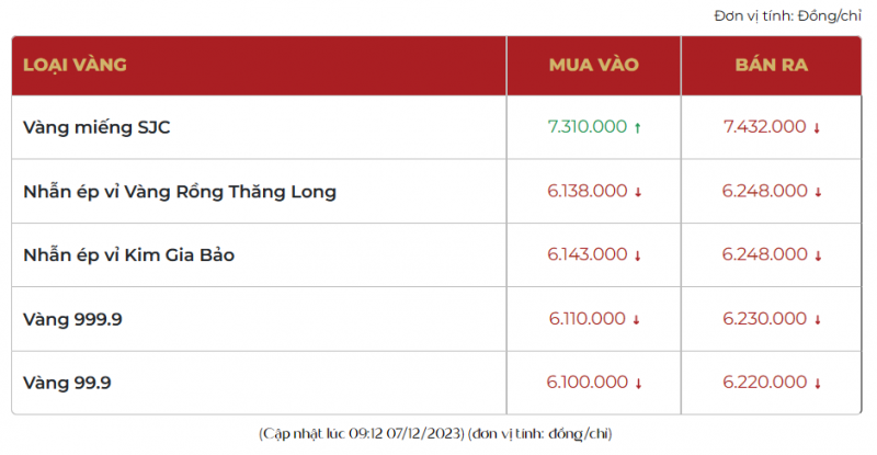 Vàng trang sức bằng Vàng rồng Thăng Long 999.9 (vàng 24k) của doanh nghiệp này giao dịch quanh mức 61,10 - 62,30 triệu đồng/lượng mua vào - bán ra, giảm 100 ngàn chiều mua vào và giảm 110 ngàn bán ra so với ngày hôm qua. Vàng trang sức bằng Vàng rồng Thăng Long 99.9 (vàng 24k) đang giao dịch quanh mức 61,00 - 62,20 triệu đồng/lượng mua vào - bán ra, giảm 150 ngàn chiều mua vào và giảm 80 ngàn chiều bán ra so với ngày hôm qua.