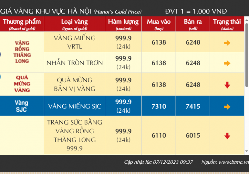 Tính đến 9h45 ngày 7/12, giá vàng nhẫn giao dịch tại Công ty Bảo Tín Minh Châu, giá trang sức bằng vàng rồng Thăng Long 999.9, nhẫn vàng trơn, Quà mừng vàng bản vị đều giao dịch quanh mức 61,38 - 62,48 triệu đồng/lượng (mua vào - bán ra), giảm 120 ngàn đồng chiều bán ra, giảm 80 ngàn đồng chiều mua vào so với ngày hôm qua.