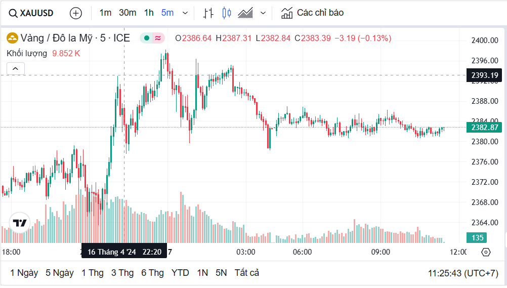 Trưa hôm nay (ngày 17/4), giá vàng thế giới giao dịch đứng quanh ngưỡng 2.382 USD/ounce. Giá vàng giao tương lai tháng 6/2024 trên sàn Comex New York ở mức 2.399,3 USD/ounce.