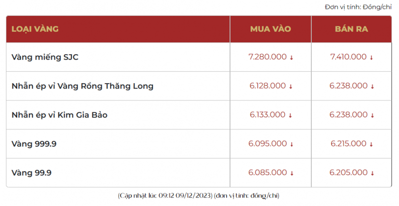 Tính đến 9h45 ngày 9/12, vàng SJC tại Hà Nội niêm yết ở mốc 73,1 - 74,08 triệu đồng/lượng mua vào - bán ra, giảm 80 nghìn đồng/lượng ở chiều mua vào so với ngày hôm qua.