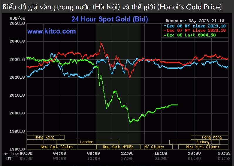 Theo dữ liệu từ Kitco, tính đến sáng 9/12 (theo giờ Việt Nam), giá vàng thế giới đang ở mức 2.004,5 USD/ounce, giảm 28,38 USD so với cùng thời điểm ngày 8/12. Quy đổi theo tỉ giá Vietcombank (chưa thuế, phí), mức giá này tương đương 59,7 triệu đồng/lượng, chênh lệch giữa giá vàng trong nước và thế giới trên 14 triệu đồng/lượng.
