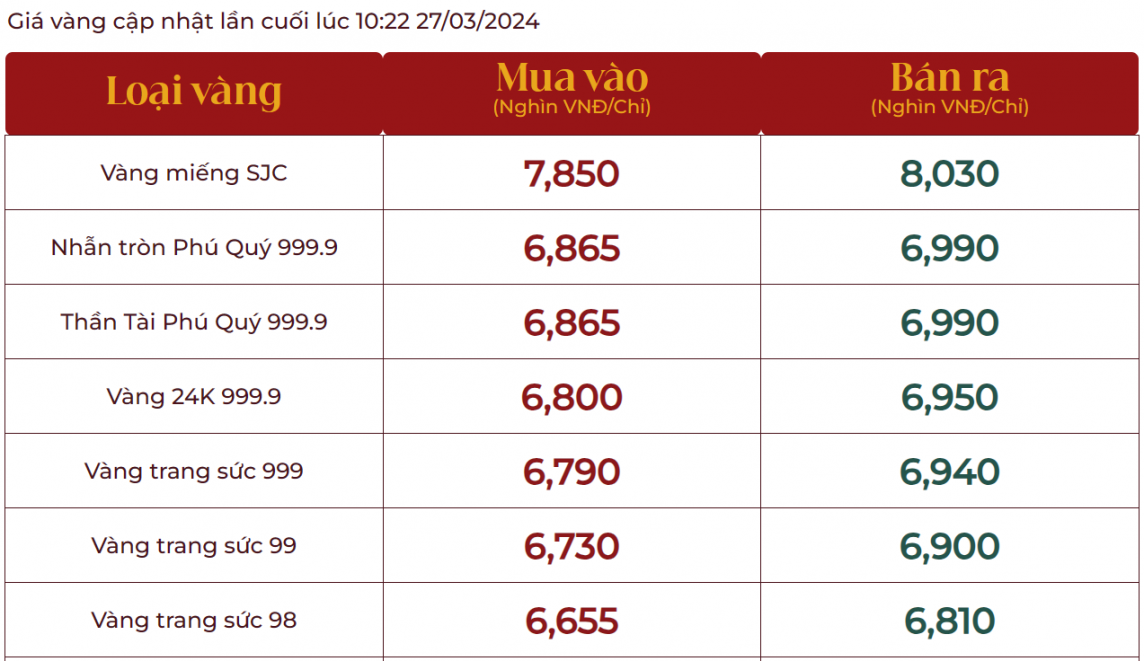| Giá vàng giao dịch tại Tập đoàn Phú Quý |