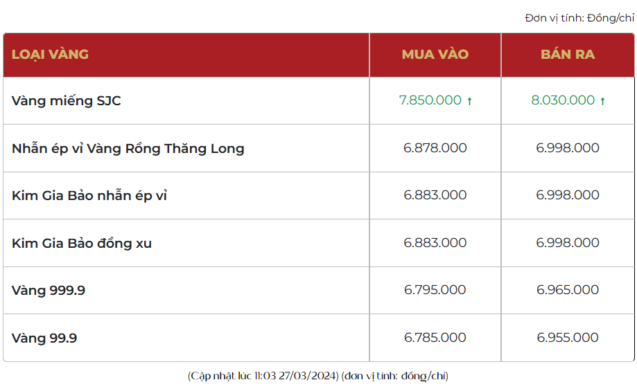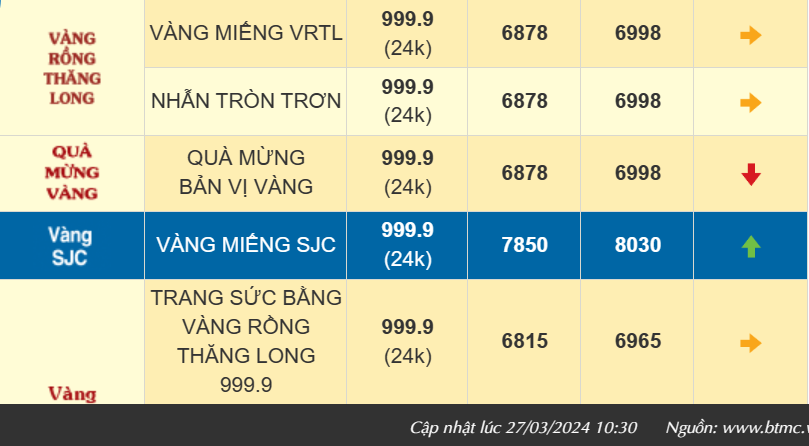 Thời điểm trưa ngày 27/3, giá vàng SJC giao dịch tại Công ty Vàng bạc đá quý Sài Gòn khu vực TP. Hồ Chí Minh quanh mức 78,50 - 80,50 triệu đồng/lượng, tăng 500 ngàn đồng/lượng chiều mua và tăng 500 ngàn đồng/lượng chiều bán so với chốt phiên hôm qua. Chênh lệch mua - bán là 2 triệu đồng/lượng.