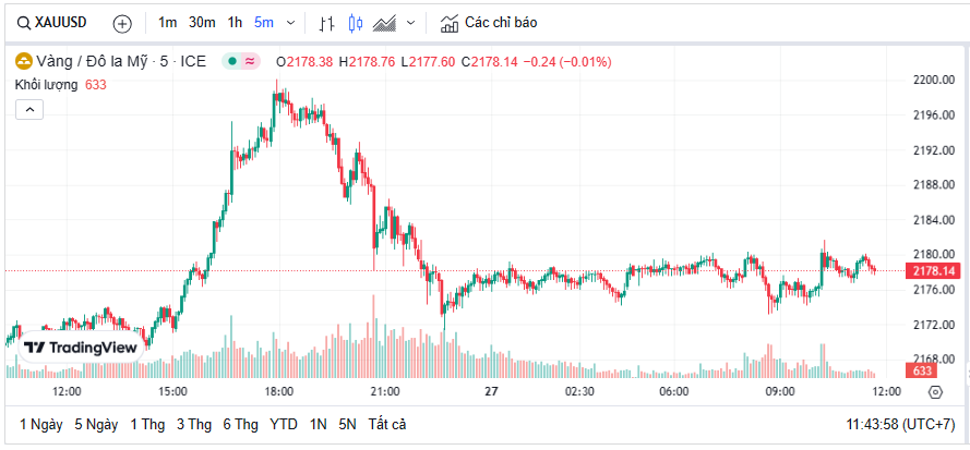 Thời điểm trưa ngày 27/3, giá vàng giao ngay tại thị trường châu Á giảm 5 USD/oz so với đóng cửa phiên ngày thứ Ba tại Mỹ, giao dịch ở mức 2.178 USD/oz - theo dữ liệu từ sàn giao dịch Kitco. Mức giá này tương đương khoảng 65,4 triệu đồng/lượng nếu được quy đổi theo tỷ giá USD bán ra tại ngân hàng Vietcombank, tăng 200.000 đồng/lượng so với sáng hôm qua.