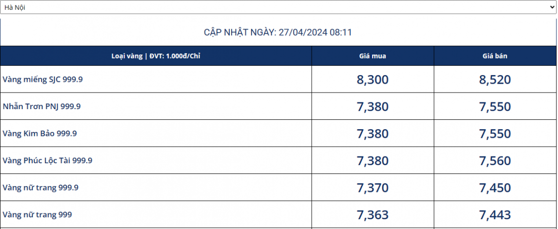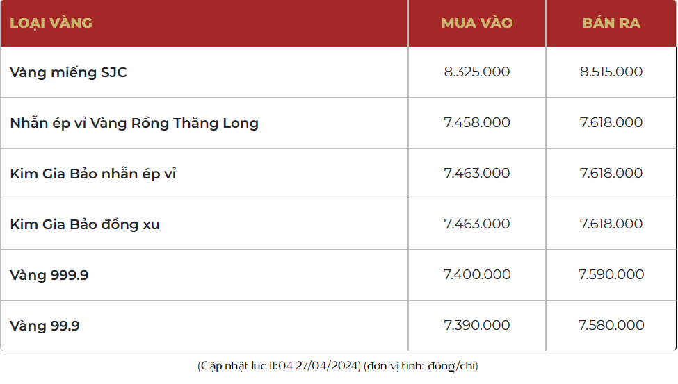 | Giá vàng giao dịch tại Công ty CP Vàng Bạc Đá Quý Phú Nhuận |