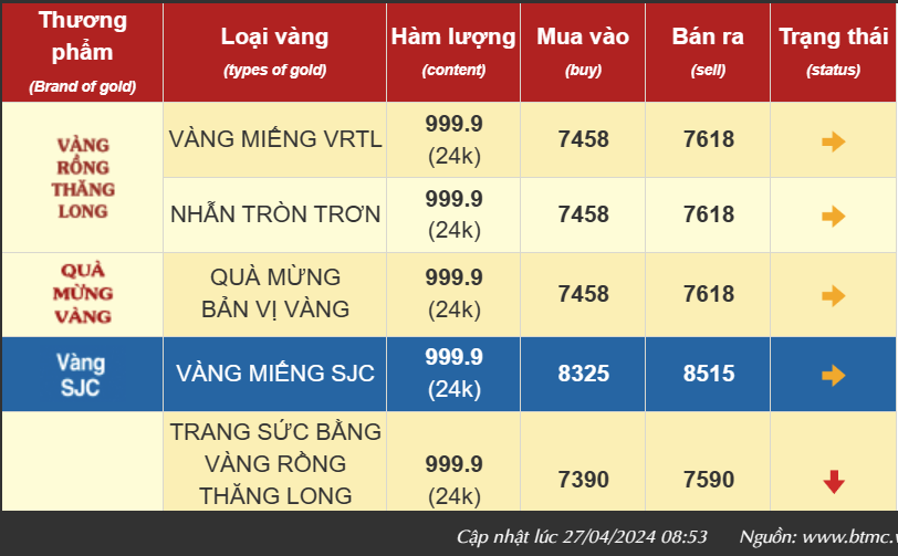 Giá vàng trong nước hôm nay tiếp đà tăng tốc theo giá vàng thế giới. Đến thời điểm trưa ngày 27/4, giá vàng SJC tăng tiếp 450 ngàn đồng/lượng so với ngày hôm qua tùy từng doanh nghiệp.