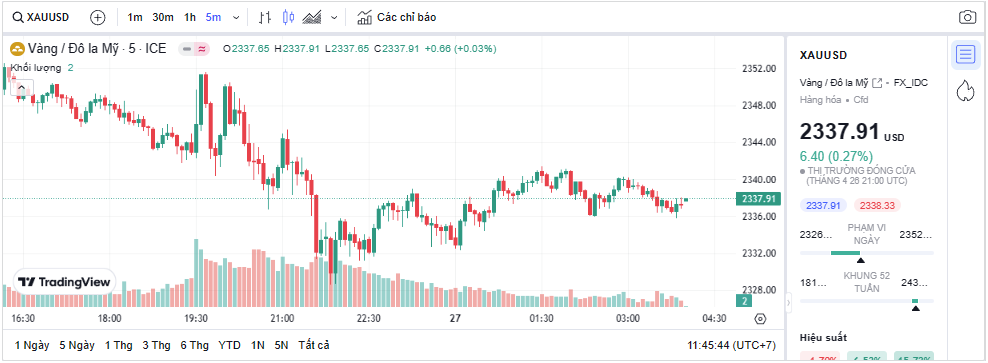 Ghi nhận vào trưa ngày 27/4, theo giờ Việt Nam, giá vàng đang giao dịch ở mức 2.337 USD/ounce, tăng 8,61 USD so với cùng thời điểm ngày 26/4. Quy theo giá USD ngân hàng, chưa tính thuế và phí, giá vàng thế giới giao ngay có giá 68,05 triệu đồng/lượng, thấp hơn khoảng 14,95 triệu đồng/lượng so với giá vàng SJC trong nước.