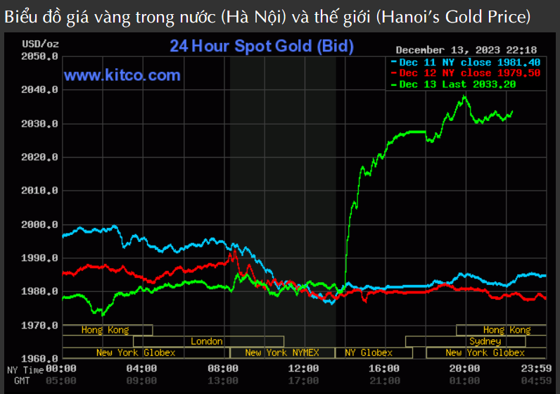 Giá vàng thế giới tăng vọt qua ngưỡng 2.000 USD/oz sau cuộc họp chính sách tiền tệ cuối cùng trong năm 2023 của Fed. Diễn biến này đúng như dự báo của thị trường, khi Fed quyết định giữ nguyên lãi suất ở mức 5,25-5,5% - mức cao nhất trong 22 năm.
