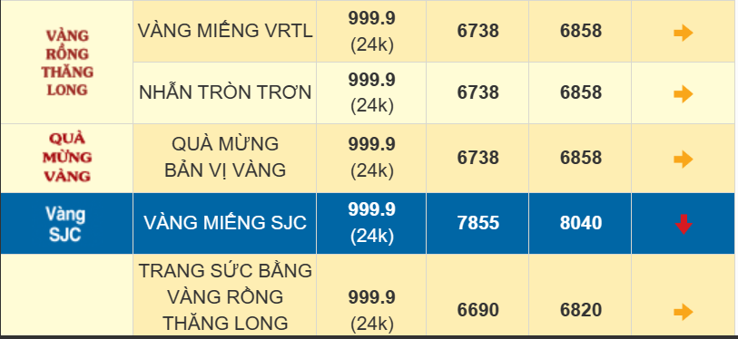 Trang sức bằng vàng rồng Thăng Long 999.9 (24k) đang giao dịch quanh mức 66,90 - 68,20 triệu đồng/lượng, tăng 650 ngàn đồng/lượng chiều mua vào và tăng 550 ngàn đồng/lượng chiều bán ra so ngày hôm qua.