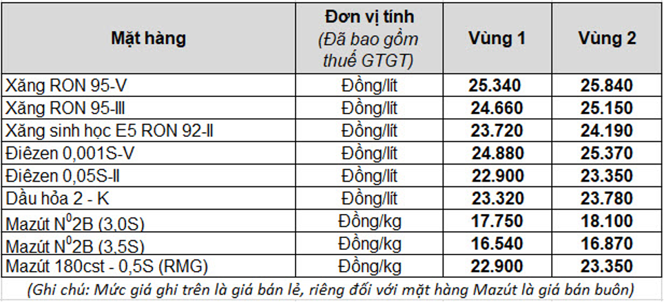 Sau kỳ điều chỉnh, xăng E5 RON 92 có giá bán tối đa là 23.720 đồng/lít, xăng RON 95 là 24.660 đồng/lít, dầu diesel là 22.900 đồng/lít, dầu hỏa 23.320 đồng/lít, dầu mazut 16.540 đồng/kg.