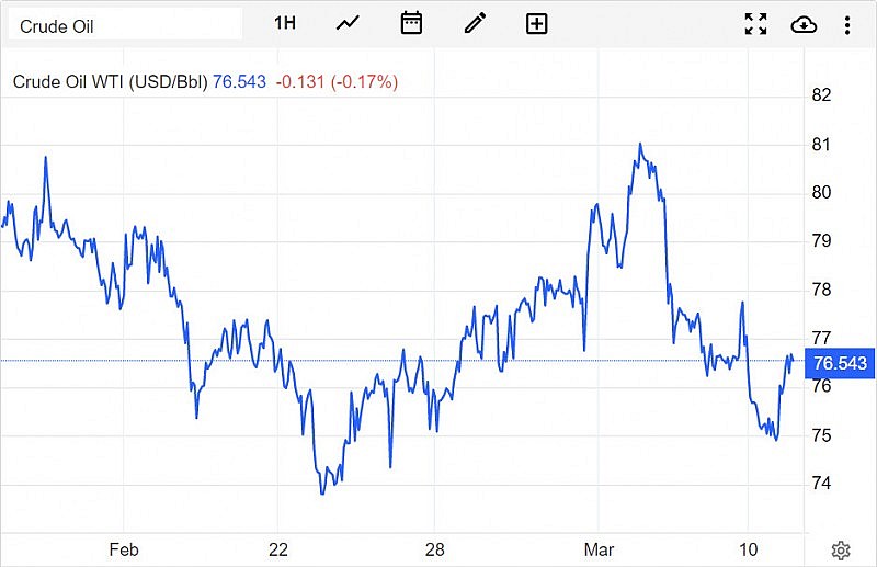 Giá dầu thế giới vào sáng ngày 13/3 (theo giờ Việt Nam) như sau: giá dầu thô WTI dao động quanh mức 76,54 USD/thùng, trong khi giá dầu Brent ở mức 82,51 USD/thùng.