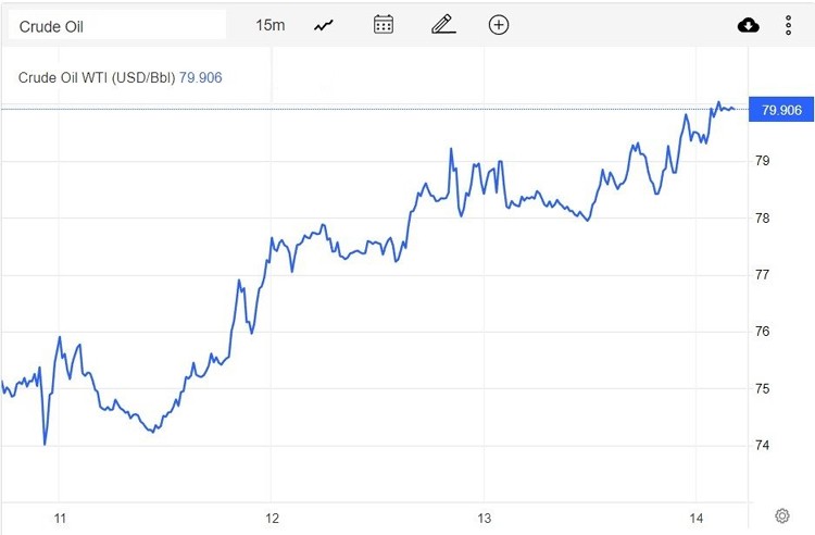 Giá dầu sáng ngày 15/1 (theo giờ Việt Nam) cụ thể là: giá dầu thô WTI của Mỹ tăng 1,64 USD, lên 79,91 USD/thùng, giá dầu Brent tăng 0,89 USD, lên mức 85,16 USD/thùng.