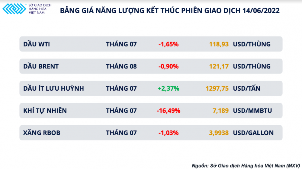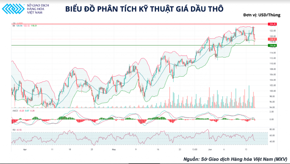 Kết thúc phiên 14/6, giá dầu thô WTI giảm 1,7% còn 118,93 USD/thùng, giá dầu thô Brent giảm hơn 0,9% còn 121,17 USD/thùng.