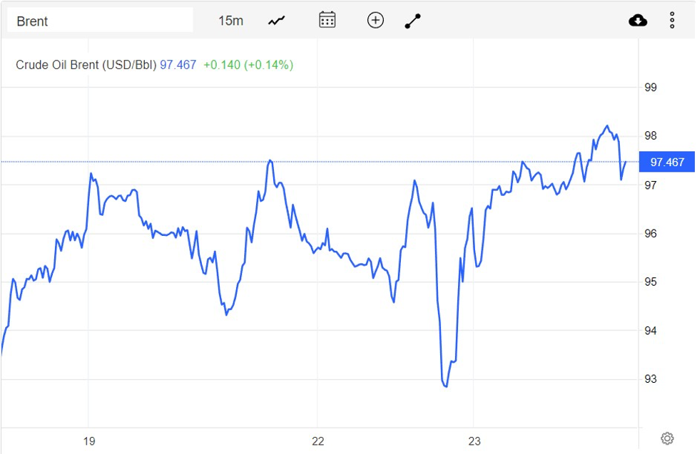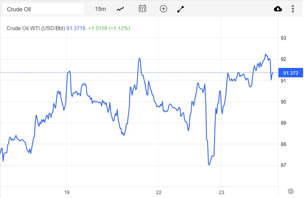 Giá dầu thế giới trong phiên giao dịch sáng ngày 24/8 (theo giờ Việt Nam) được ghi nhận: Dầu thô WTI của Mỹ tăng 0,72 USD, đạt ngưỡng 91,37 USD/thùng, trong khi giá dầu thô Brent giao tháng 10 tăng 0,94 USD, giá hiện là 97,47 USD/thùng.